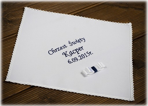 - Szatka do Chrztu w kształcie kwadratu, z personalizowanym haftem w kolorze granatowym, obszyta cienką bawełnianą koronką.