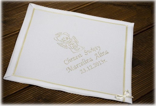 : biała szatka w kształcie kwadratu z wyhaftowanymi imionami i datą Chrztu Dziecka oraz dekoracją.