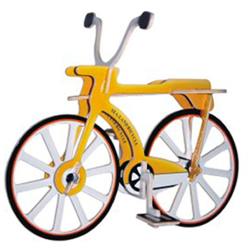 ROWER- wykonany ze sklejki drewnianej z gotowych powycinanych elementów.Całość pokryta jest kolorowym papierem kredowym który przypomina naturalny wygląd modelu.Pojedyncze elementy układanki wyciskamy z szablonu i łączymy ze sobą według instrukcji na rysunku poglądowym.W celu utrwalenia składankę można podkleić klejem do drewna i pomalować według własnej fantazji lub pozostawić w stanie naturalnym.