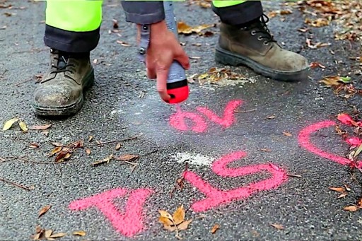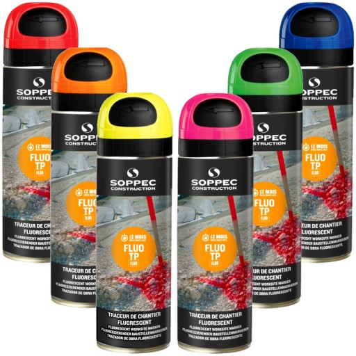 - Farba geodezyjna mocno fluorescencyjna w aerozolu Fluo TP marki Soppec do wykonywania oznaczeń na terenie budowy, o trwałości aż do 12 miesięcy