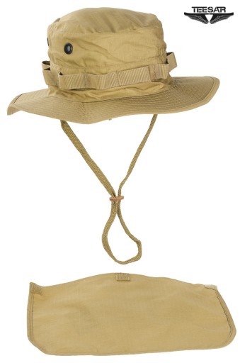 Uszyty z bardzo wytrzymałego materiału Rip-Stop. Rip-Stop to specjalna technologia wzmacniania materiału poprzez dodanie w splot materiału włókien nylonu - charakterystyczna kratka. Materiał gruby i trwały a jednocześnie przewiewny, szybkoschnący i oddychający. Wyposażony w odpinany nakarczek chroniący szyję przed słońcem. Wywietrzniki z gęstą kratką która zapobiega wdarciu się insektów pod kapelusz. Szerokie i usztywniane rondo chroni przed słońcem oraz deszczem, dodatkowo przeszywane. Kapelusz w okół obszyty nylonową taśmą do mocowania maskowania lub moskitiery. Regulowany sznurek pod brodę z grubym skórzanym stoperem.