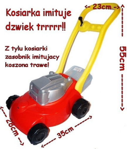Kosiarka to produkt włoskiej firmy z najwyższej jakości plastiku. Zestaw zawiera pojemnik z granulkami i śmigiełko, które dzięki obracaniu się podczas jazdy daję efekt koszonej trawy.