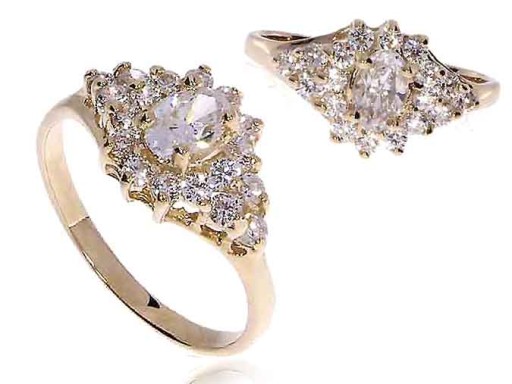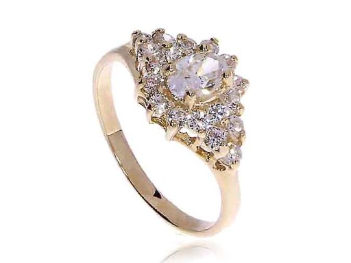 Okazały i oszałamiająco piękny pierścionek z klasycznego złota. Centralną jego część stanowi duża cyrkonia Swaroskiego, wokół której znajdują się mniejsze. Cała kompozycja tworzy coś w rodzaju kwiatu. Pierścionek niewiarygodnie się mieni. Stanowi rzecz, o której marzy każda kobieta, jest pełen przepychu i bogactwa. Emanuje elegancją i klasą.