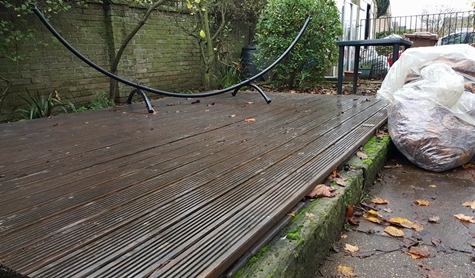 Na zamieszczonych zdjęciach widać olej do tarasów Decking Oil po dwóch latach na deskach, na których przez okres jesienno-zimowy zalegały liście.