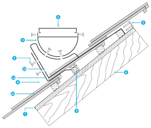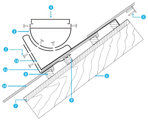 - W pierwszej kolejności montujemy dolną część wspornika (1a), tak aby dolna krawędź następnej dachówki znajdowała się w odległości ok. 1 cm od dolnej części wspornika. Wspornik przykręcamy do łaty pomocniczej wkrętami do drewna z łbem stożkowym min. Ø6 mm x 45 mm lub wkrętami do drewna z łbem sześciokątnym o średnicy Ø8 mm (5).