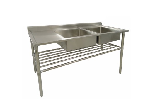 ZLEW NIERDZEWNY, ZLEWOZMYWAK GASTRONOMICZNY (WOLNOSTOJĄCY), DWUKOMOROWY Z OCIEKACZEM, WODOSZCZELNYM RANTEM NA ŚCIANĘ ORAZ FUNKCJONALNĄ PÓŁKĄ