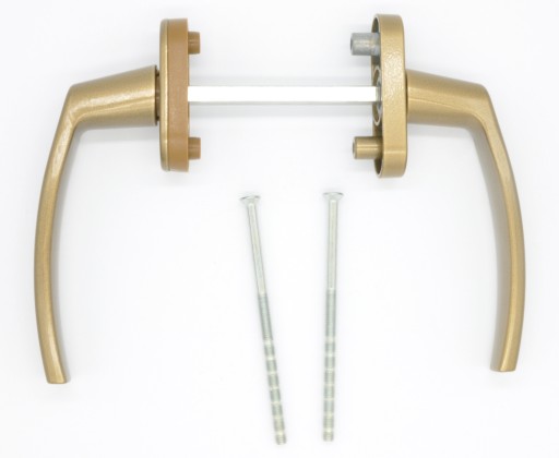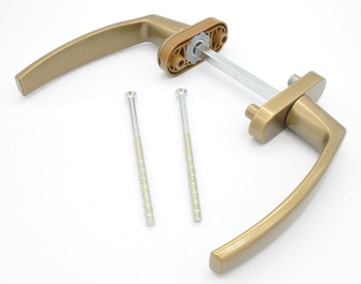 Opis: klamka wykonana jest z metalu polakierowanego na kolor gold/patyna (podstawa, do której wkręca się wkręty jest metalowa, a podstawa w drugiej klamce wykonana jest z tworzywa). Klamka umożliwia zamykanie drzwi balkonowych tak od wewnątrz jak i od zewnątrz. Wkręty montażowe są tak przygotowane, że ich długość można dopasować do grubości dowolnego okna. Klamka wyposażona jest w mechanizm zatrzaskowy (tzn. ruch klamki nie jest płynny tylko skokowy) umożliwiający ustawienie klamki w różnych pozycjach: okno zamknięte, otwarte, rozszczelnione itd. Montaż polega na odkręceniu starych klamek (2 wkręty zakryte zaślepkami) i przykręceniu w miejsce starych - nowych klamek, po uprzednim przewierceniu otworów w skrzydle okna na trzpień prowadzący oraz na wkręty umożliwiające skręcenie klamek. Klamki przykręca się dwoma wkrętami fi 5,0 mm.
