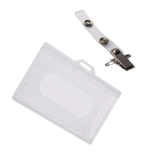 Holder (Identyfikator) plastikowy twardy przeźroczysty z plastikowym paskiem zapinanym na metalowy zatrzask oraz żabką i agrafką