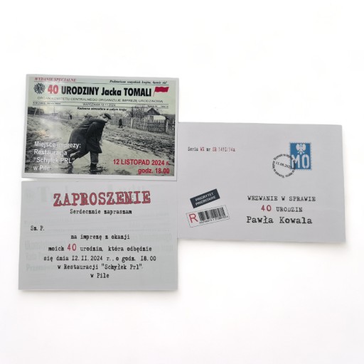 - Proszę podać dane dzięki którym wykonamy projekt zaproszenia; które urodziny, datę, miejsce i godzinę imprezy lub możemy zostawić do samodzielnego wpisania. (np. wzór 1, urodziny 40, Jan, 24.08.2024 r., restauracja "Oka" w Parczewie,)