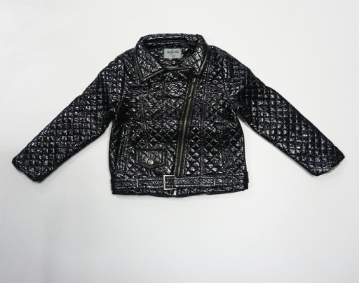 Czarna kurtka zapinana na ukos na zamek. U dołu kurtki pasek. Rękawy zakończone krótkimi zamkami, które można rozpiąć. Z przodu na dole dwie kieszonki i jedna na górze zapinana na zamek. Wewnątrz podszewka.