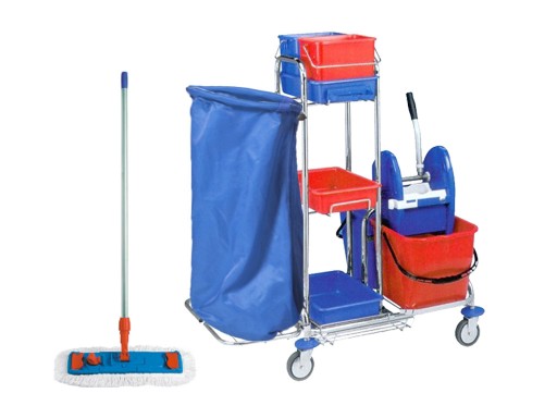 Wózka sprzątający wyposażony w stelaż pod worek na śmieci 120 litrów, 3 kuwety i 2 wiaderka na podręczną chemię i ściereczki. Posiada dwa wiadra wykonane z wysokiej jakości tworzywa ABS, charakteryzującego się dużą wytrzymałości na pęknięcia. Wykorzystano w nim prasę szczękową typu down-press, dzięki której proces wyżymania jest lekki. Prasa ta współpracuje z mopami płaskimi, sznurkowymi oraz kentucky. Wózek posiada kółka, które są wytrzymałe i stabilne oraz nie rysują podłoża w trakcie jazdy. Został wykonany z niesłychaną precyzją, dzięki czemu jest odporny na pęknięcia i na działanie chemii przemysłowej.