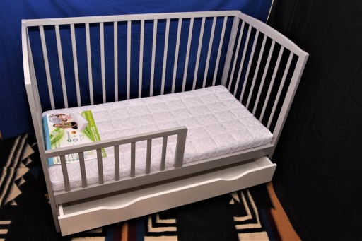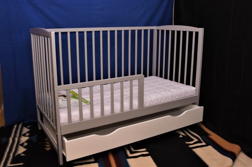 Łóżeczko wykonane jest z drewna sosnowego I gatunku, z możliwością zamiany na tapczanik dla starszego dziecka poprzez wymontowanie boku i zamontowaniu "drabinki" zabezpieczającej (drabinka zabezpieczająca w zestawie), natomiast szuflada z płyty meblowej, pokryte nietoksycznymi farbami i lakierami posiadającymi atest.