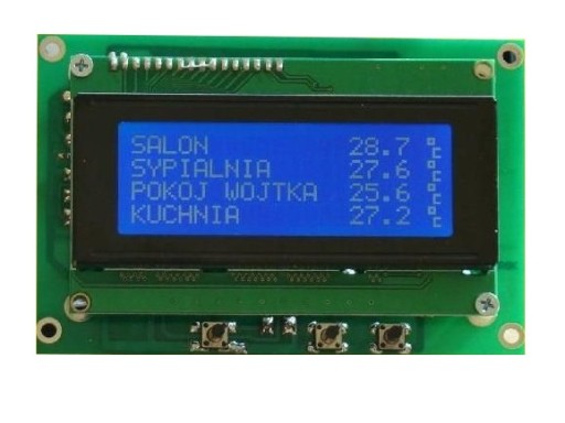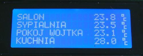 - tryb 1: czyli wyświetlanie naraz po 4 temperatury z czujników. Czyli wtedy sterownik okresowo wyświetlania temperatury z czujników nr 1 do 4 albo wyświetla z czujników nr 5 do 8. W tym trybie możemy nadać czujnikom własne nazwy (13 znaków dla każdego czujnika). Zmiana ekranów (wyświetlanie czujników 1 do 4 lub 5 do 8) odbywa się automatycznie co ustawiony przez użytkownika czas w zakresie co 1 do 180 sekund z krokiem co 1 sekundę.
