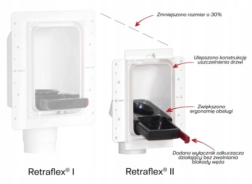 Kaseta gniazda systemu Retraflex® w nowej odsłonie. W zmodyfikowanej konstrukcji zmniejszono wymiary o 30%, dodano wyłącznik odkurzacza działający bez zwalniania blokady węża, zwiększono ergonomię obsługi i ulepszono konstrukcję uszczelnienia drzwi.