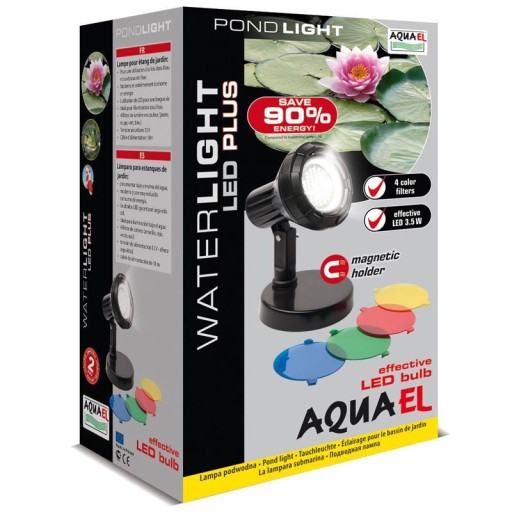AQUAEL WATERLIGHT LED PLUS to nowoczesna lampa oświetleniowa do zbiorników wodnych, która wykorzystuje energooszczędną technologię ledową. Ma postać klasycznego reflektorka, jednak miejsce tradycyjnej żarówki zajęła żarówka ledowa z wysokowydajnymi diodami LED. Pozwala to na znaczne ograniczenie zużycia energii i zmniejszenie nagrzewania się lampy podczas pracy. Hermetyczna obudowa WATERLIGHT LED PLUS sprawia, że może być ona stosowana zarówno pod, jak i nad wodą. Wykorzystana do produkcji WATERLIGHT LED PLUS technologia LED charakteryzuje się długą żywotnością.