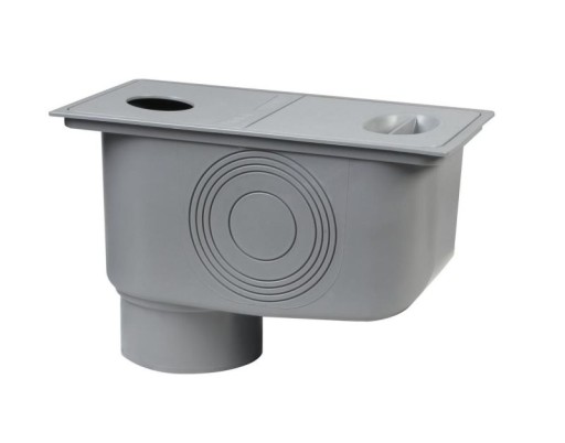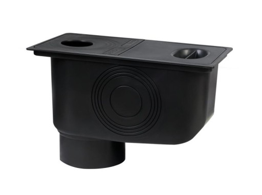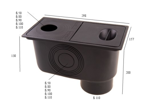 Korpus studzienki podrynnowej posiada odpływ pionowy dla rur kanalizacyjnych o średnicy Ø 110mm. Na ściankach bocznych korpusu znajdują się dodatkowe wytłoczenia na rury kanalizacyjne o średnicy Ø 50; Ø 80; Ø 90; Ø 100; Ø 110mm które w razie potrzeby można wyciąć i podłączyć odpływ boczny.