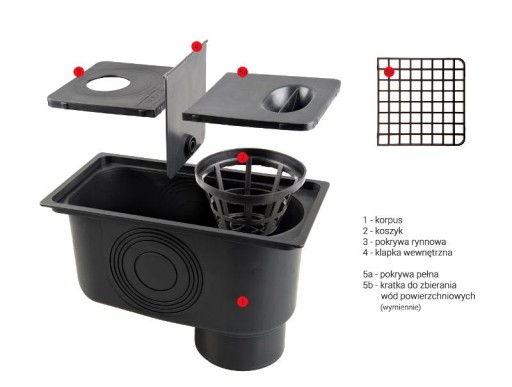 Pokrywa studzienki składa się z pokrywy rynnowej i pokrywy pełnej. Pokrywa rynnowa posiada wytłoczenia do wycięcia dla rur spustowych o średnicy Ø 50; Ø 80; Ø 90; Ø 100; Ø 110mm. Pokrywa pełna umożliwia rewizję i czyszczenie z zanieczyszczeń.