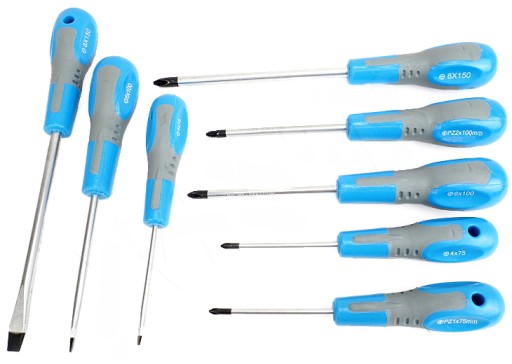 - Wkrętaki płaskie: 4x75mm ; 6x100mm ; 8x150mm