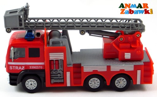 Model posiada obracaną o 360 stopni wysuwaną drabinkę z armatką wodną oraz posiada napęd pull-back. Model wykonany jest z metalu (kabina) oraz z elementów plastikowy(naczepa, podwozie).