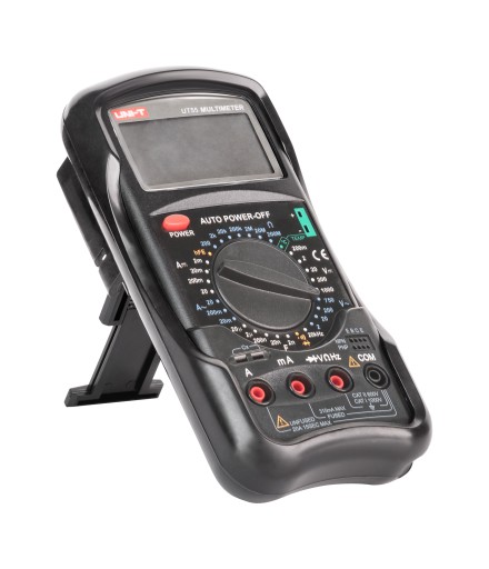 Multimetr pozwala na pomiar napięcia stałego i zmiennego, natężenia przepływu prądu stałego i zmiennego, rezystancji, pojemności oraz częstotliwości. Pomiar temperatury w zakresie -40÷1000°C umożliwia dołączona sonda. Ciągłość obwodu sygnalizowana jest poprzez sygnał dźwiękowy. Urządzenie posiada funkcję testowania tranzystorów oraz opcję automatycznego wyłączenia po 30 min. bezczynności. Miernik zasilany jest popularną baterią 9V, która również znajduje się w zestawie. O jej poziomie rozładowania informuje cyfrowy wskaźnik. Duży, czytelny wyświetlacz oraz dołączona smycz ułatwiają użytkowanie multimetru. Całość przesyłana jest w odpowiednio zabezpieczonym, oryginalnym pudełku.