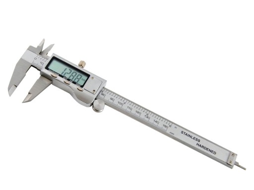 Suwmiarka elektroniczna (w metalowej obudowie wyświetlacza).