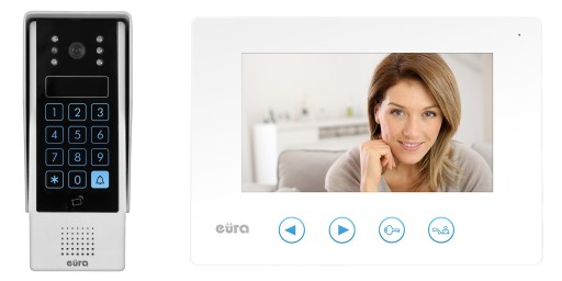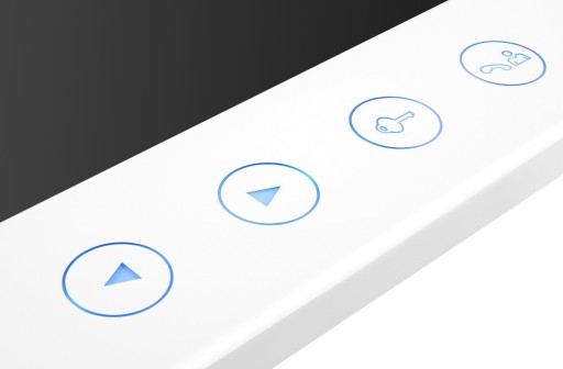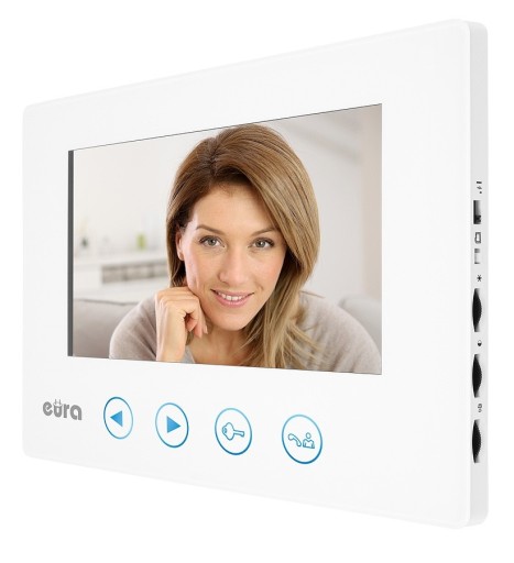 z doskonałą jakością obrazu z ekranem 7", wyposażony jest w pokrętła regulacyjne umożliwiające dostosowanie głośności rozmowy, jasności oraz nasycenia wyświetlacza. Używając przycisku znajdującego się nad nimi użytkownik może wybrać jedną z 16 dostępnych melodii gongu, a przesuwając przełącznik - zmienić jej głośność. Dodatkowo monitor wyposażono w pamięć mogącą pomieścić do 100 zdjęć z kasety zewnętrznej, które można przeglądać przełączając dotykowe przyciski w prawo lub lewo.