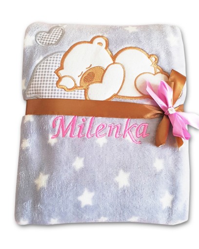 Kocyk dla dziecka, na którym możemy wyhaftować imię dziecka, datę urodzenia, całą metryczkę.