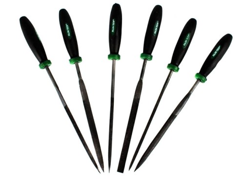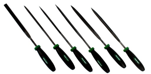 6 pilników o różnym kształcie: okrągły, półokrągły, trójkątny, kwadratowy, płaski, płaskozbieżny