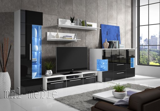 Nowoczesna meblościanka z frontami w wysokim połysku pokryte specjalną akrylową powłoką dającą niesamowity efekt wysokiego połysku oraz oświetleniem led. Korpus wykonany z odpornej na zarysowania płyty laminowanej koloru białego.