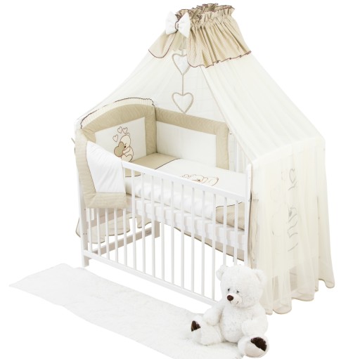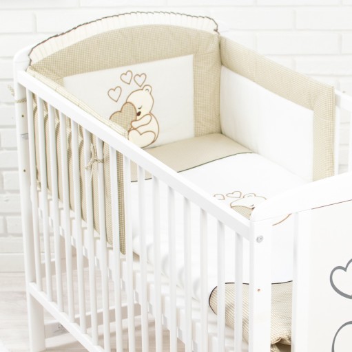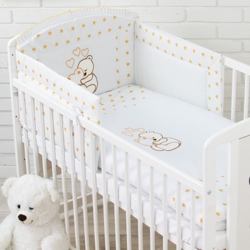 3. Ochraniacz na szczebelki z wyższym zagłówkiem, zaokrąglonym, dopasowanym do każdego łóżeczka. Ozdobiony ślicznym dużym HAFTEM podkreśla piękno całej pościeli. Odpowiednio skrojony i uszyty, dodatkowo przepikowany po środku i po bokach z długimi troczkami nie ulega deformacji nawet po wielu praniach. Dodatkowo zdobiony ozdobną falbanką.