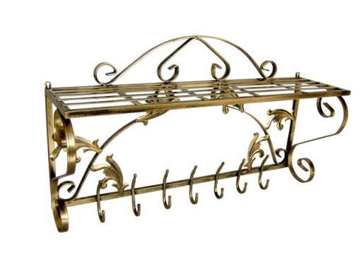 Przedstawiona na zdjęciach trwale i estetycznie wykonana z metalu półka ścienna z wieszakami. Oprócz walorów użytkowych przedmiot spełni również funkcje dekoracyjną. Wieszak udekorowany metalowymi liśćmi.