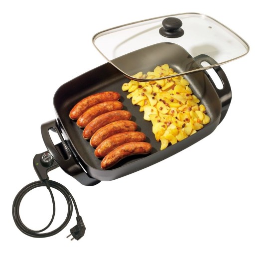 Patelnia uniwersalna prostokątna elektryczna z powłoką nieprzywierającą. Szklana pokrywka. Głębokość około 8 cm. Wymiary wewnętrzne: 37x28,5 cm.