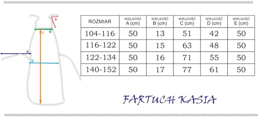 Fartuch dostępny jest w trzech rozmiarach, przeznaczonych dla dzieci w różnym wieku, zaczynając od 3 a kończąc na 16 latach.