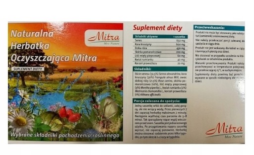 Naturalna Herbatka Oczyszczająca Mitra to suplement diety w postaci herbatki w saszetkach sporządzonej na bazie naturalnych składników pochodzenia roślinnego o udokumentowanym działaniu fizjologicznym na organizm człowieka. Produkt ten jest przeznaczony dla osób, które dbają o prawidłowe funkcjonowanie układu pokarmowego oraz układu moczowego.