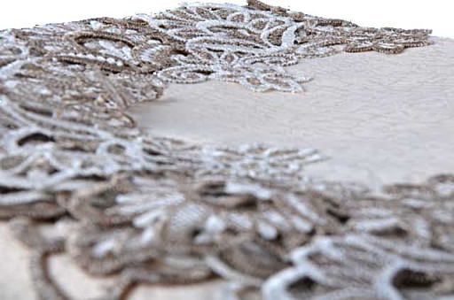 Piękny obrus z tkaniny poliestrowej ozdobiony gipiurą,która zdobi środek jak i zwisającą jego część