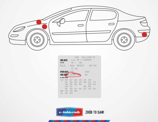 - Odpowiedni odcień dorabiamy na podstawie kodu koloru. Oznaczenie to zwykle znajduje się na wklejce lub tabliczce znamionowej zamontowanej w różnych miejscach pojazdu w zależności od konkretnego modelu i marki.