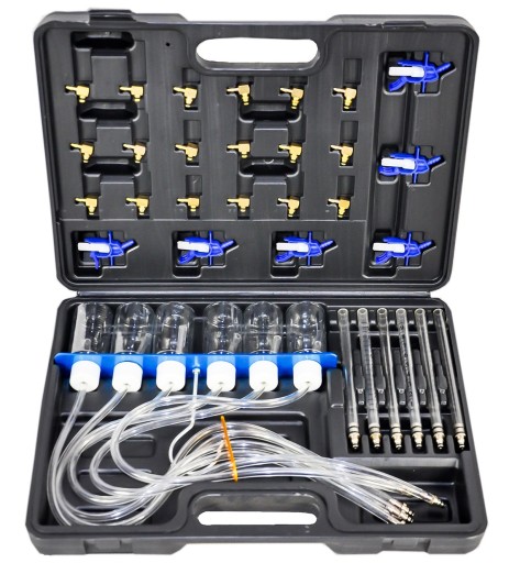 - Pozwala na łatwą i szybką diagnozę wtryskiwaczy na podstawie pomiaru ilości paliwa odprowadzanego na przelewie wtryskiwaczy.