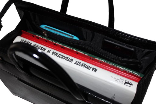 Teczka posiada liczne kieszonki i przegrody. Na zewnątrz kieszeń na przodzie, druga kieszeń na tylnej ściance. Wewnątrz miejsce na telefon i tablet (na zdjęciu 7cali), a także kolejne dwie kieszonki z zamkiem. Spód teczki zabezpieczony metalowymi puklami. Estetyczne dodatki, mocne nitowane rączki. Do torebki dołączony jest pasek na ramię o długości 105cm.