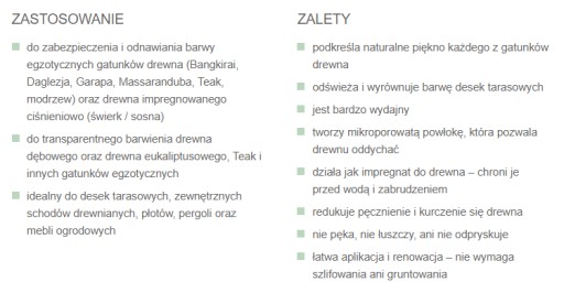 Ten nowoczesny olej do tarasów tworzy hydrofobową, mikroporowatą powłokę, która pozwala drewnu swobodnie oddychać, redukując pęcznienie i kurczenie się drewna. Dzięki temu nie pęka, nie łuszczy się ani nie odpryskuje (tak robią to wszystkie lakiery do drewna). Oleje tarasowe wygładzają powierzchnię drewna, pielęgnują je i zabezpieczają przed wnikaniem brudu i wody.Renowacja powierzchni pokrytej olejem tarasowym jest łatwa i szybka – nie wymaga szlifowania ani gruntowania przed aplikacją kolejnej warstwy, można też odnowić jedynie najbardziej zużyte fragmenty tarasu.Oleje do tarasów firmy Osmo są idealnie dopasowane do typowej barwy każdego z gatunków drewna, więc bez problemu pozwalają zachować, odnowić lub wyrównać naturalny kolor desek tarasowych. Zapewniają ochronę drewna przed szarzeniem pod wpływem promieni UV.Bezbarwny Olej tarasowy Teak (007) nie zawiera pigmentów i nie zapewnia ochrony UV. Jeżeli nie chcemy uzyskać na tarasie efektu naturalnej patyny, przed aplikacją oleju do tarasów należy pokryć drewno jedną z pigmentowych powłok Osmo.