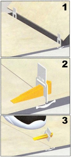 Umieść następną płytkę dosuwając ją do klipsów. Wsuń klin do tworu w klipsie (dociśnij), aby wyrównać obie płytki względem siebie.
