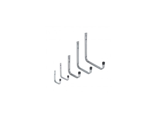 Pojedynczy hak garażowy wykonany z rurki stalowej, lakierowany w kolorze srebrno-popielatym (nie są chromowane).