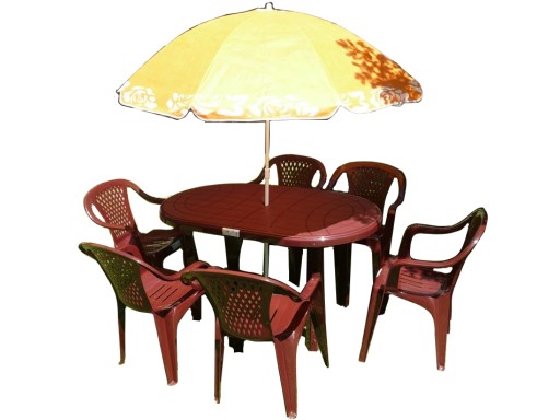 -wykonany z mocnego plastiku, solidny i trwały-bardzo łatwy w złożeniu- na środku stół posiada otwór na parasol oraz dwie zaślepki w zestawie (biała i w kolorze bordo)