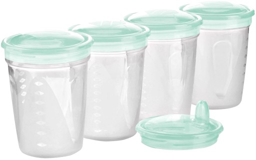 Pojemniki na mleko matki, soki i inne pokarmy przeznaczone są do wielorazowego przechowywania oraz mrożenia pokarmu. Dodatkowa pokrywka z ustnikiem umożliwia bezpośrednie podanie pokarmu dziecku. Przed pierwszym i po każdym użyciu produkt należy dokładnie umyć i wyparzyć wrzątkiem. Pojemniki wykonane są ze specjalnego tworzywa przeznaczonego do kontaktu z żywnością, nie zawierającego Bisfenolu A.