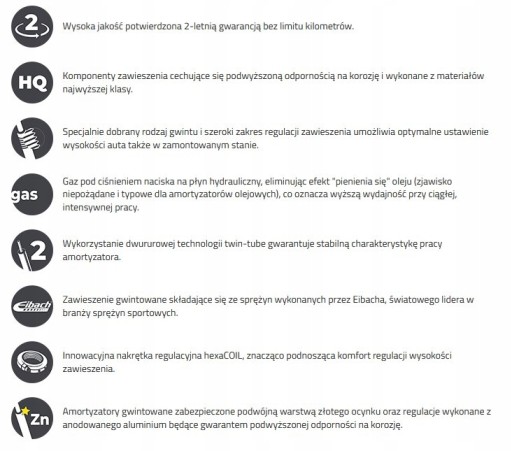 Dwie kompletne przednie kolumny regulowane, kompletne tylne zawieszenie regulowane, klucz do regulacji wysokości.