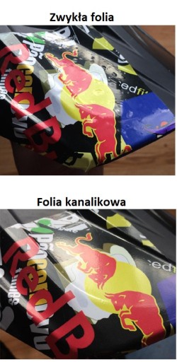 Oferowany przez nas stickerbomb wykonywany jest na specjalnej folli z klejem kanalikowym. Oznacza to ze od spodu folia posiada mikro nacięcia które uniemożliwiają powstawanie bąbelków powietrza podczas naklejania. Najlepiej różnice pomiędzy zwykła folia a nasza widać na zdjęciu obok.