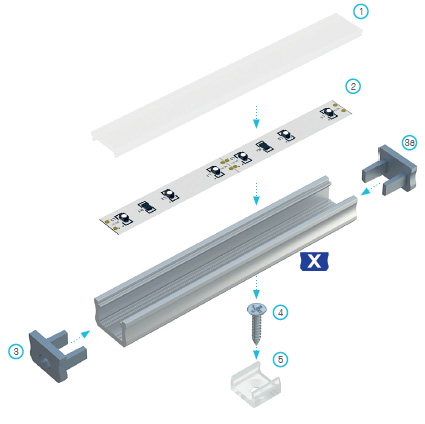 Schemat złożenia elementów systemu oświetleniowego z wykorzystaniem profilu X oraz (1) klosza SLIM, (2) taśmy LED, (3) zaślepki z otworem, (3a) zaślepki bez otworu, (4) wkrętu montażowego, (5) uchwytu montażowego X