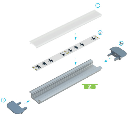 Schemat złożenia elementów systemu oświetleniowego z wykorzystaniem profilu Z wpuszczanego oraz (1) klosza BASIC, (2) taśmy LED, (3) zaślepek z otworami