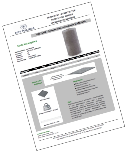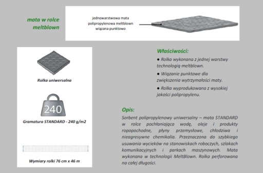 Sorbent polipropylenowy – mata STANDARD w rolce pochłaniająca wodę, oleje i produkty ropopochodne, płyny przemysłowe, chłodziwa i nieagresywne chemikalia. Przeznaczona do szybkiego usuwania wycieków na stanowiskach roboczych, szlakach komunikacyjnych i parkach maszynowych. Mata wykonana w technologii MeltBlown. Rolka perforowana na całej długości.