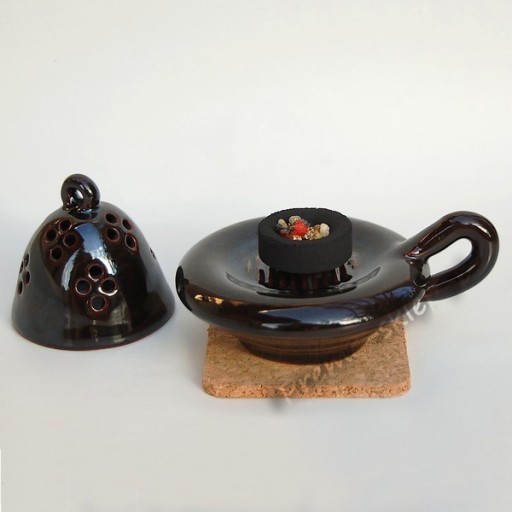 Kadzielniczka gliniana, pokryta ciemnobrązową glazurą. Dzięki dwukrotnemu wypalaniu w piecu jest odporna na temperaturę rozgrzanego węgielka. W odróżnieniu od kadzielnic metalowych, kadzielniczka ceramiczna nie rozgrzewa się w tak szybkim tempie, dzięki czemu można ją bezpiecznie przenosić. W komplecie z drewnianą podstawką, w celu lepszej izolacji termicznej od podłoża.