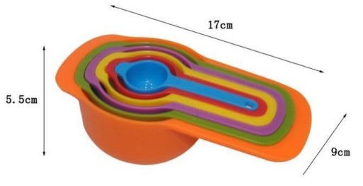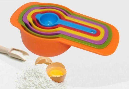 Praktyczne, plastikowe miarki kuchenne, służące do dozowania wybranych produktów płynnych oraz sypkich.